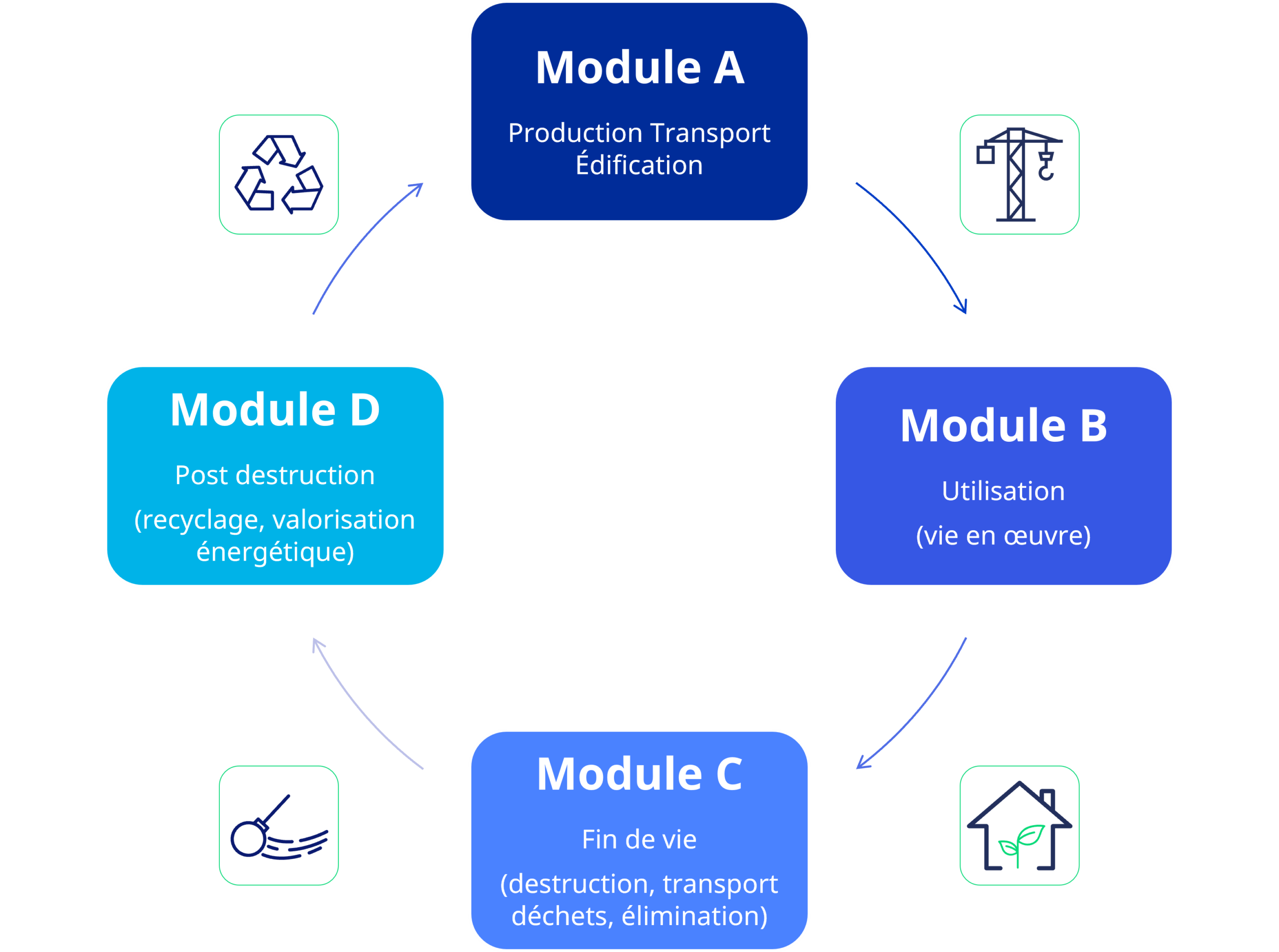Dans la RE2020, le calcul d’Analyse du Cycle de Vie (ACV) vise à évaluer l’empreinte environnementale globale d’un bâtiment sur une période de référence de 50 ans. Il prend en compte l’ensemble des phases du cycle de vie : production des produits et équipements (modules A1-A3), transport et mise en œuvre (A4-A5), phase d’usage incluant maintenance et remplacement (B), fin de vie (C) ainsi que les bénéfices et charges au-delà du cycle de vie (D). Les résultats sont exprimés à travers plusieurs indicateurs environnementaux, dont le principal est l’indicateur carbone Ic construction, qui mesure les émissions de gaz à effet de serre liées aux composants du bâtiment.